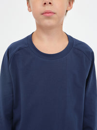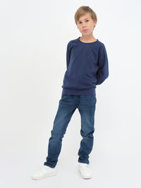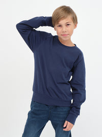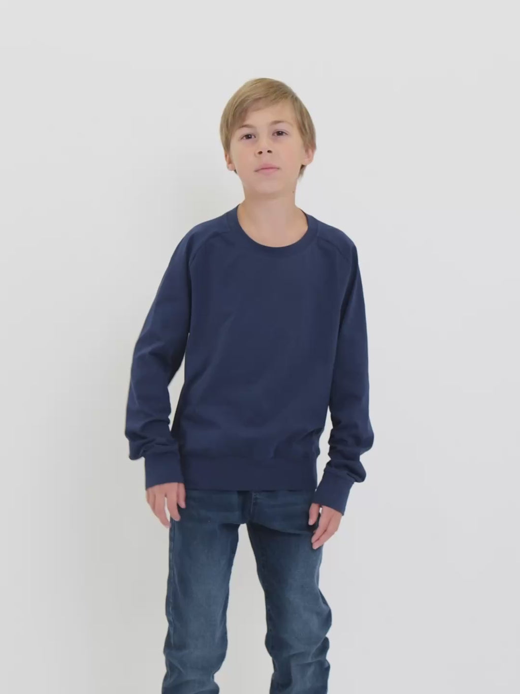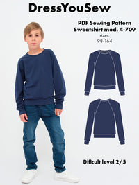 Relaxed children's sweatshirt sewing pattern with raglan sleeves, eliminating the shoulder seam. It does not have pockets and the sleeves are finished with cuffs, sewing digital PDF pattern. Skill Level 2/5.