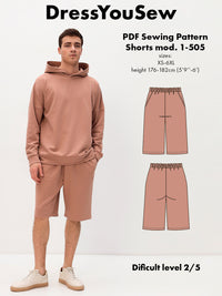 Wide straight-cut men's shorts. Side pockets. Elastic waistband, sewing digital PDF pattern. Skill Level 2/5.