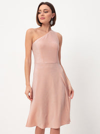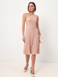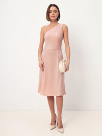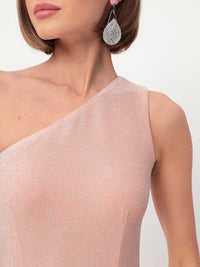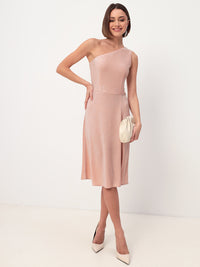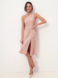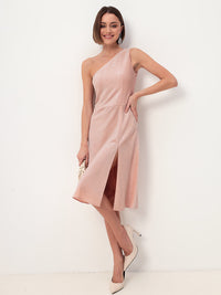 Cocktail dress with asymmetrical bodice on one shoulder. Bodice lined. Skirt cut on bias. Front slit. Side closure with invisible zipper. No pockets.