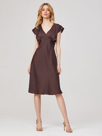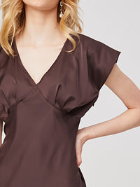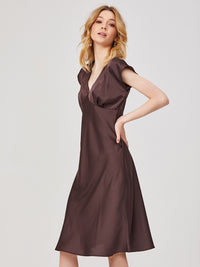 Semi-fitted silhouette dress, empire waistline. The skirt is cut on the bias with pleats at the bottom of the bodice. Side closure with an invisible zipper. Unlined.