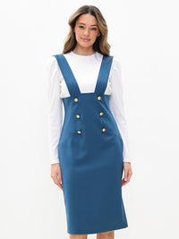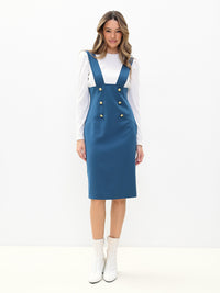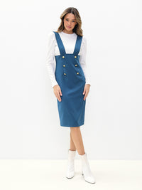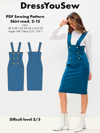 Straight-cut jumper skirt with wide straps sewing pattern. Side closure with an invisible zipper. It features a separate side panel in the front and darts in the back. The top of the skirt is finished with a facing.