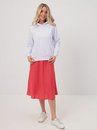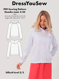 Hoodie with raglan sleeves without a shoulder seam. It does not have pockets, the sleeves end with cuffs, and the hood is unlined. Skill Level 2/5.