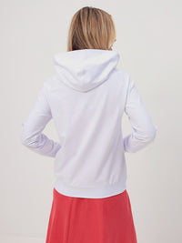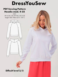 Suggested fabrics: Dense knitted fabrics such as Footer three-thread, Footer two-thread, Fleece, Ponte, Scuba, Sweatshirt Fleece, Double Knit, Jersey. For cuffs and waistband use a rib knit. The hoodie in the photo is made of two-thread cotton footer.
