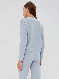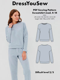 Suggested fabrics: Dense knitted fabrics such as Footer three-thread, Footer two-thread, Fleece, Ponte, Scuba, Sweatshirt Fleece, Double Knit, Jersey. For cuffs and waistband use a rib knit. The sweatshirt in the photo is made of two-thread cotton footer.