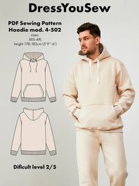 This hoodie has a hood end a front kangaroo pocket. The waist and sleeves have cuffs, sewing digital PDF pattern. Skill Level 2/5.