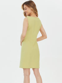 Semi-fitted silhouette dress without sleeves. Includes concealed side zipper. There are darts on the front bodice and back waist. The neckline and armholes are finished with facings. Unlined.