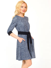 Dress with flared skirt and pockets. Sleeves with roll-up cuffs. Back invisible zipper closure. Removable belt, unlined.