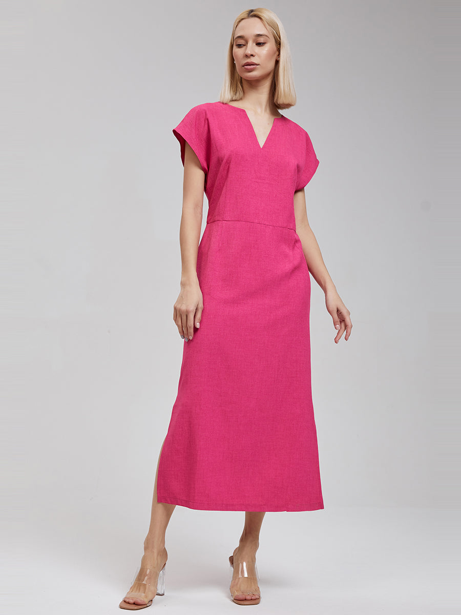 Midi-dress with a seam along the waistline and a hidden zipper on the side. Short sleeves comes as a single cut. Curved neck turning into V-neck. Side slits at the bottom of the dress. Without lining. Removable belt.