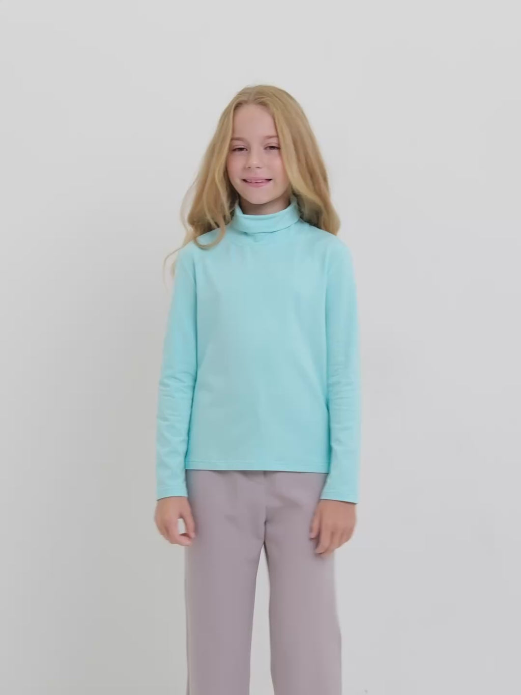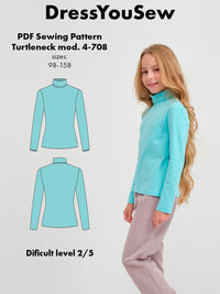 A semi-fitted turtleneck for girls with set-in sleeves. A high stand-up collar, sewing digital PDF pattern. Skill Level 2/5.